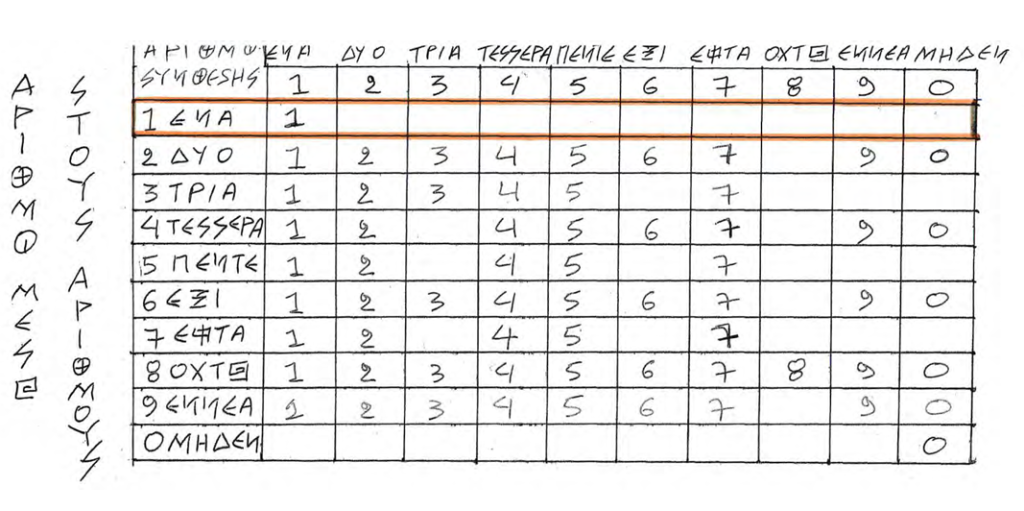 ΑΡΧΙΖΟΝΤΑΣ ΑΠΟ ΤΟΝ ΠΡΩΤΟ ΕΛΛΑΝΙΟ ΑΡΙΘΜΟ, ΤΟ Ι ΕΝΑ, ΤΗΝ Ι ΜΟΝΑΔΑ, ΒΛΕΠΟΥΜΕ ΟΤΙ Η Ι ΜΟΝΑΔΑ, ΤΟ Ι ΕΝΑ, ΔΕΝ ΕΧΕΙ ΣΤΗΝ ΣΥΝΘΕΣΗ ΤΟΥ ΚΑΝΕΝΑΝ ΕΛΛΑΝΙΟ ΑΡΙΘΜΟ. Η ΣΥΝΘΕΣΗ ΤΗΣ Ι ΜΟΝΑΔΟΣ, ΤΟΥ Ι ΕΝΑ, ΕΙΝΑΙ ΜΟΝΑΔΙΚΗ ΚΑΙ ΕΧΕΙ ΜΕΣΑ ΣΤΗΝ ΣΥΝΘΕΣΗ ΤΟΥ ΜΟΝΟ ΤΟΝ ΙΔΙΟ ΤΟΝ ΜΟΝΑΔΙΚΟ ΔΗΜΙΟΥΡΓΙΚΟ ΕΑΥΤΟΝ ΤΟΥ, ΩΣ ΔΗΜΙΟΥΡΓΟΣ ΟΛΩΝ ΤΩΝ ΕΛΛΑΝΙΩΝ ΑΡΙΘΜΩΝ, ΩΣ ΔΗΜΙΟΥΡΓΟΣ ΤΩΝ ΠΑΝΤΩΝ, ΤΩΝ ΟΛΩΝ.