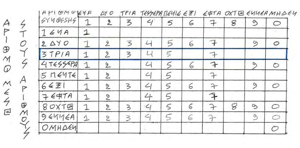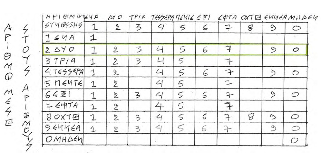 ΕΦΟΣΟΝ ΟΛΟΚΛΗΡΩΣΑΜΕ ΟΛΕΣ ΤΙΣ ΑΝΑΠΤΥΞΕΙΣ ΤΩΝ ΣΥΝΘΕΣΕΩΝ ΟΛΩΝ ΤΩΝ ΕΛΛΑΝΙΩΝ ΑΡΙΘΜΩΝ ΑΝΑΛΥΤΙΚΑ ΣΕ ΟΛΗ ΤΗΝ ΔΙΑΣΠΑΣΗ ΜΑΣ, ΣΤΟΝ ΠΑΡΑΠΑΝΩ ΠΙΝΑΚΑ ΔΙΑΓΡΑΦΟΝΤΑΙ ΟΛΑ ΤΑ ΑΠΟΤΕΛΕΣΜΑΤΑ ΤΩΝ ΣΥΝΘΕΣΕΩΝ ΚΑΙ ΤΩΝ ΣΥΝΔΕΣΕΩΝ ΚΑΙ ΤΩΝ 10 ΔΕΚΑ ΕΛΛΑΝΙΩΝ ΑΡΙΘΜΩΝ. ΒΛΕΠΟΥΜΕ ΣΤΟΝ ΣΥΓΚΕΚΡΙΜΕΝΟ ΧΑΡΤΗ ΚΑΙ ΠΙΝΑΚΑ ΜΑΣ ΠΟΙΟΥΣ ΑΡΙΘΜΟΥΣ ΕΧΕΙ ΣΤΗΝ ΣΥΝΘΕΣΗ ΤΗΣ ΔΗΜΙΟΥΡΓΙΑΣ ΤΟΥ Ο ΚΑΘΕ ΕΛΛΑΝΙΟΣ ΑΡΙΘΜΟΣ.